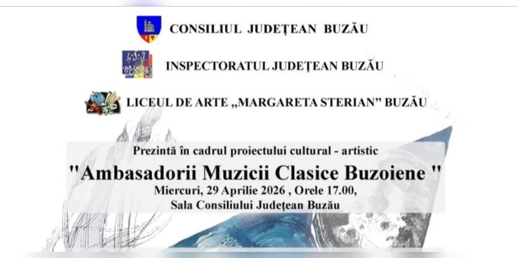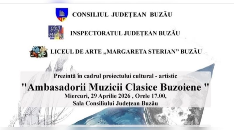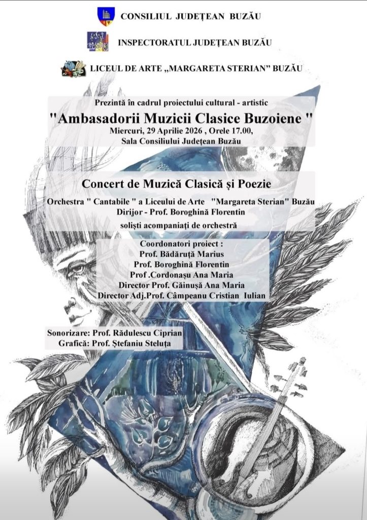 Buzăul devine, la final de aprilie, un punct de întâlnire pentru iubitorii de artă și muzică clasică. Liceul de Arte „Margareta Sterian” Buzău, în parteneriat cu Consiliul Județean Buzău și Inspectoratul Județean Buzău, organizează miercuri, 29 aprilie 2026, de la ora 17:00, un eveniment cultural-artistic deosebit: concertul „Ambasadorii Muzicii Clasice Buzoiene”.