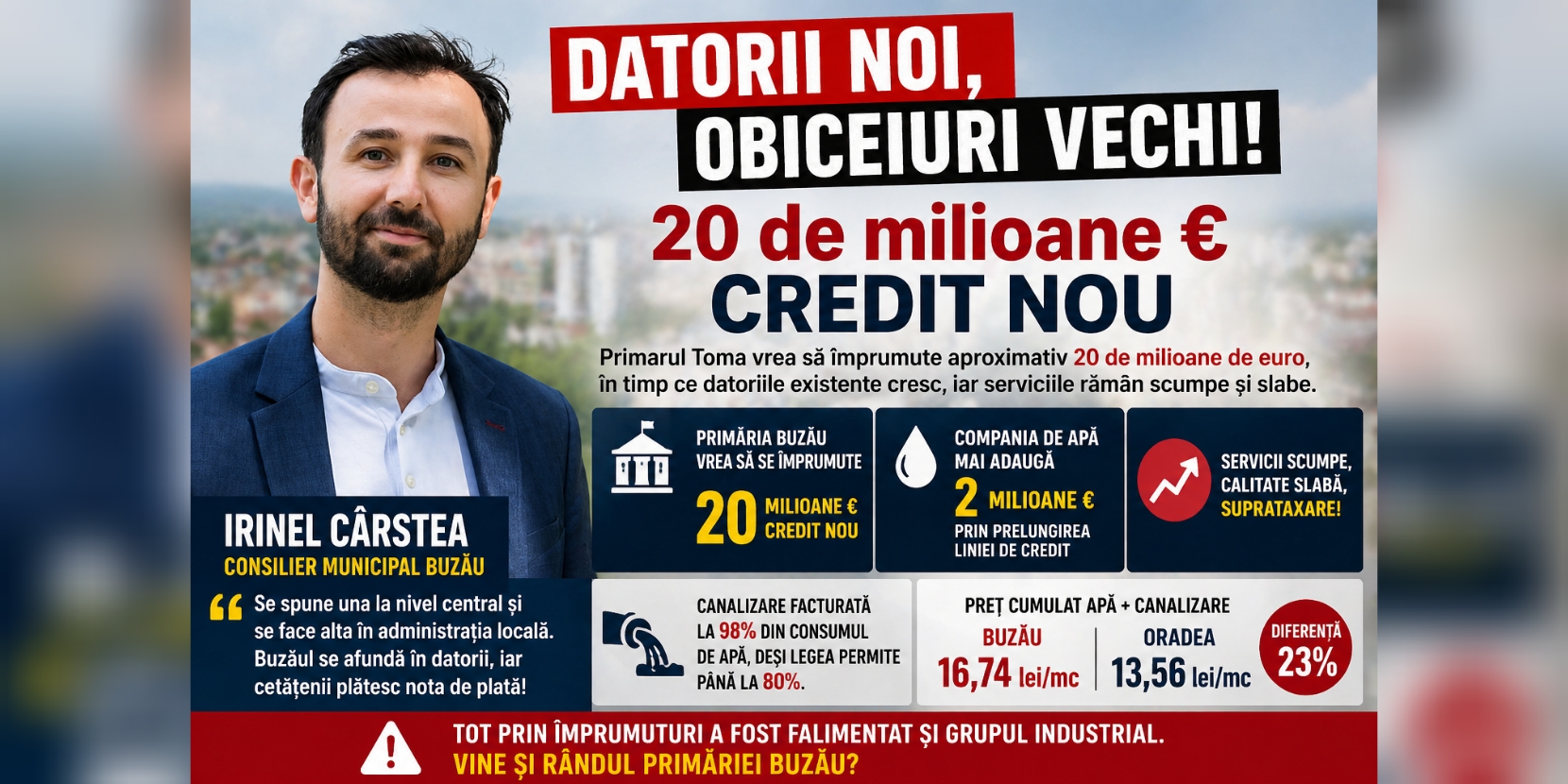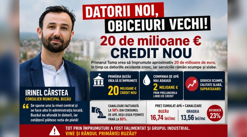 Consilierul municipal Irinel Cârstea lansează un nou atac dur la adresa administrației conduse de primarul Constantin Toma, acuzând o politică financiară riscantă și lipsită de coerență. În centrul criticilor se află intenția Primăriei Buzău de a contracta un credit de aproximativ 20 de milioane de euro.
