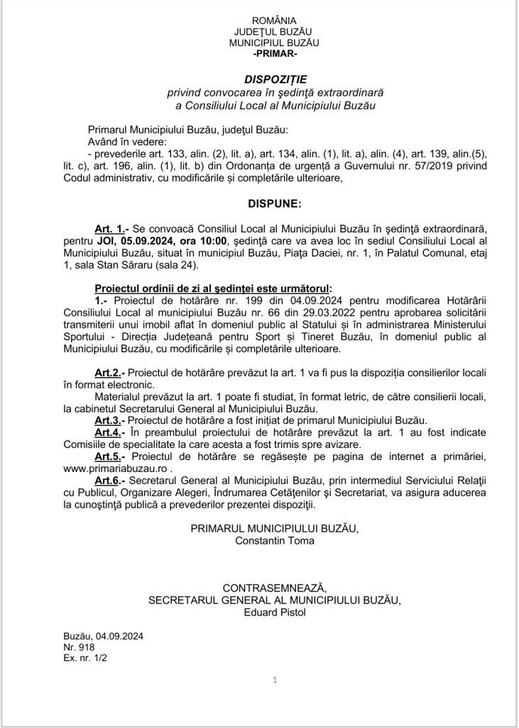 ANUNȚURI DISPOZIȚIE – privind convocarea în şedinţă extraordinarăa Consiliului Local al Municipiului Buzău septembrie 4, 2024septembrie 4, 2024 admin 0 Comments