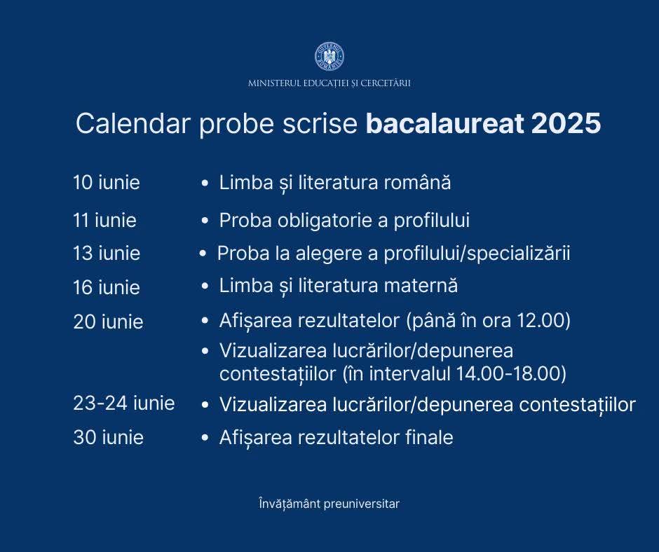 Eventualele contestații vor fi depuse tot în data de 20 iunie, iar soluționarea acestora va avea loc în perioada 23-24 iunie. Rezultatele finale ale Bacalaureatului 2025 vor fi făcute publice în data de 30 iunie.