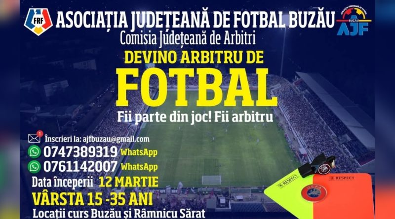 Comisia Județeană de Arbitri Buzău îi așteaptă pe toți cei interesați să facă primul pas către o carieră în arbitraj și îi roagă pe cei care citesc acest anunț să îl distribuie, pentru ca informația să ajungă la cât mai mulți tineri pasionați de fotbal.
