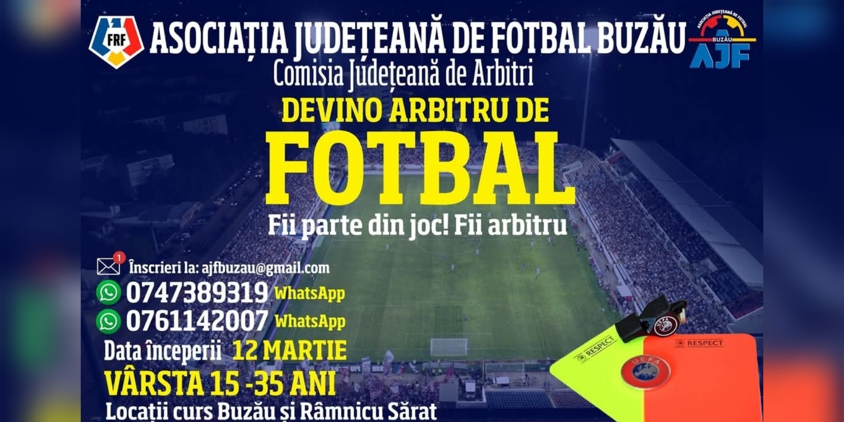 Comisia Județeană de Arbitri Buzău anunță deschiderea unei noi ediții a Școlii de Arbitri, adresată tinerilor și tinerelor cu vârste cuprinse între 15 și 35 de ani, pasionați de sport și dornici să facă parte din lumea fotbalului dintr-o perspectivă diferită.