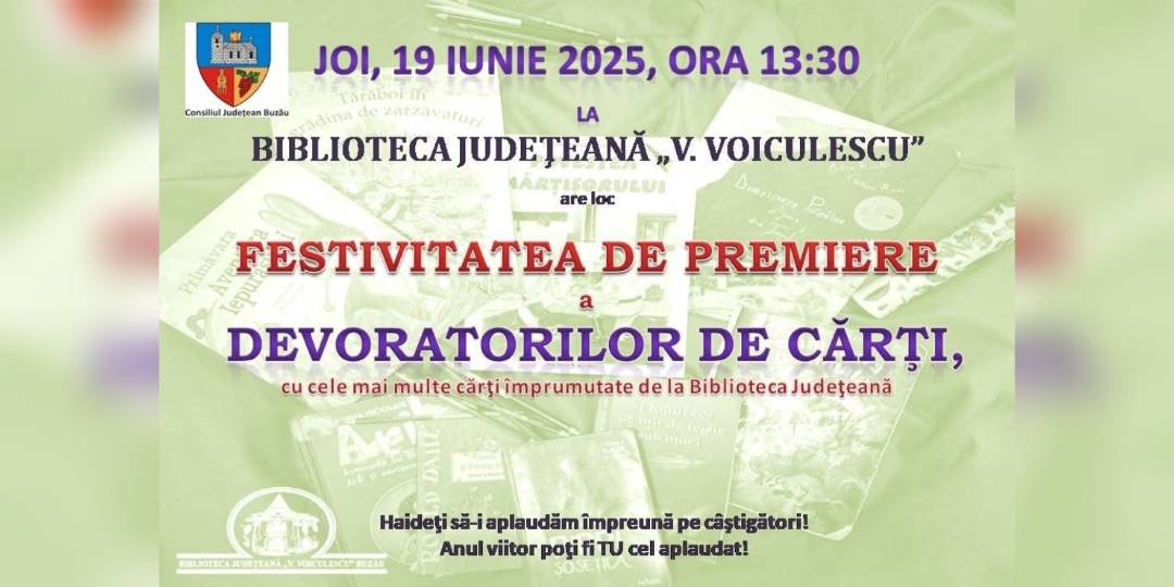 Biblioteca Județeană „V. Voiculescu” din Buzău continuă să încurajeze lectura în rândul celor mici, organizând joi, 19 iunie 2025, începând cu ora 13:30, la sediul din Galleria Mall, o festivitate specială de premiere a celor mai activi cititori – adevărații „devoratori de cărți”.